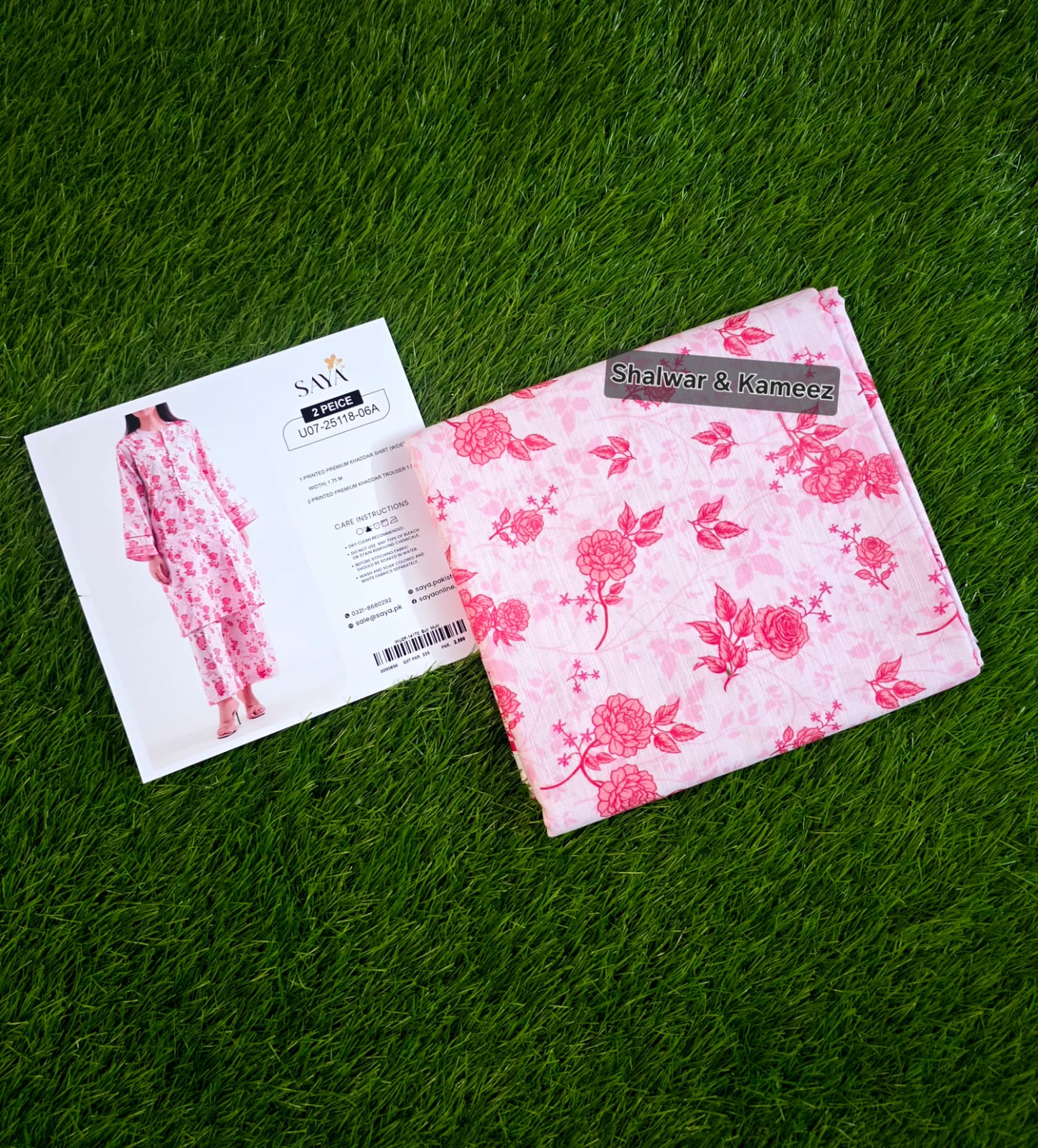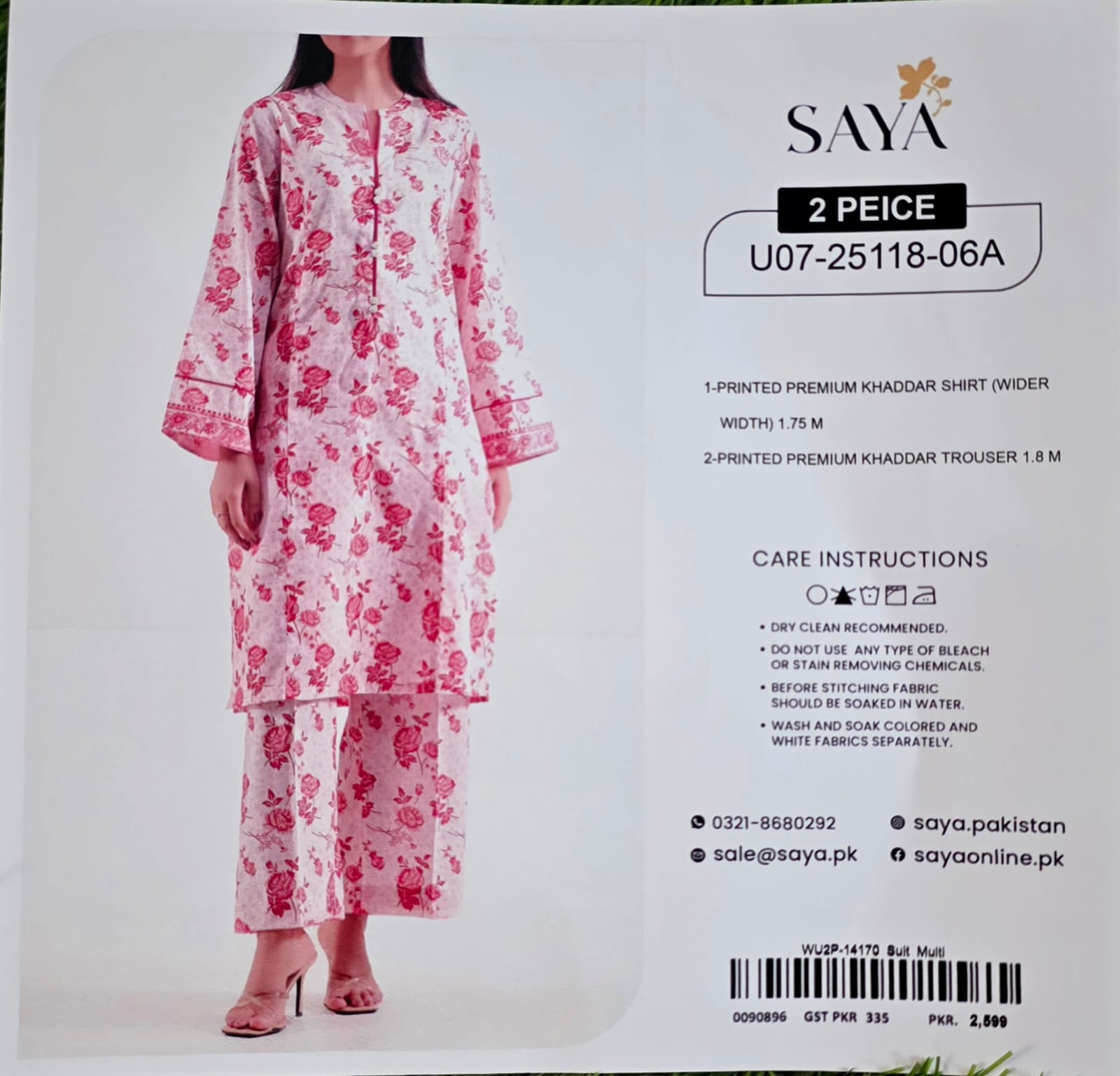 Upgrade your wardrobe with this 2-piece unstitched Premium Khaddar suit from SAYA. Includes a printed Khaddar shirt (1.75M) and matching printed Khaddar trouser (1.8M). Soft, premium-quality fabric perfect for winter. Care instructions: dry clean only, avoid bleach or stain removers, and soak colored and white fabrics separately. Stylish, comfortable, and ideal for casual or festive occasions